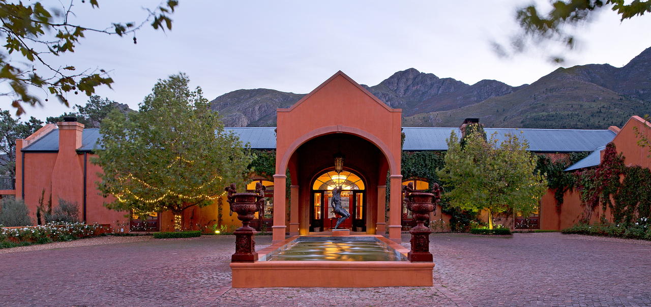 Step into the Great Hall and be transported to a world of exquisite beauty, opulence and grandeur in this luxury Franschhoek hotel. Glittering Indian chandeliers hang from the vaulted ceiling, original artwork and huge mirrors grace the walls, while the furnishings of Liz Biden are plush, colourful and stylish. Elegant antiques and exquisite flowers create a feeling of refinement and sophistication. The 11 Suites at the hotel are ideal for couples while the 5 Vineyard Suites offer privacy and space for families and groups of friends.
