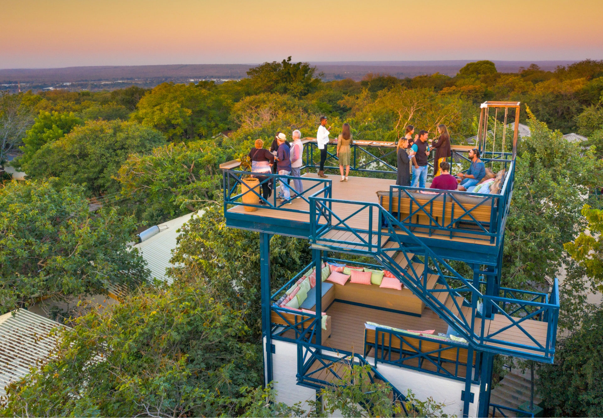 The rooms surround a unique Lookout Tower, which offers stunning views of the Zambezi River, and the mist rising above the world-famous Victoria Falls, for which the lodge takes its local name. Just 1 kilometre from town, and 2 kilometres from Victoria Falls, the Shongwe Lookout Tower offers you the chance to enjoy a different point of view and to see the world with fresh eyes. Exclusivity, quality, and tranquillity are at the heart of what Shongwe’s luxury rooms provide.
