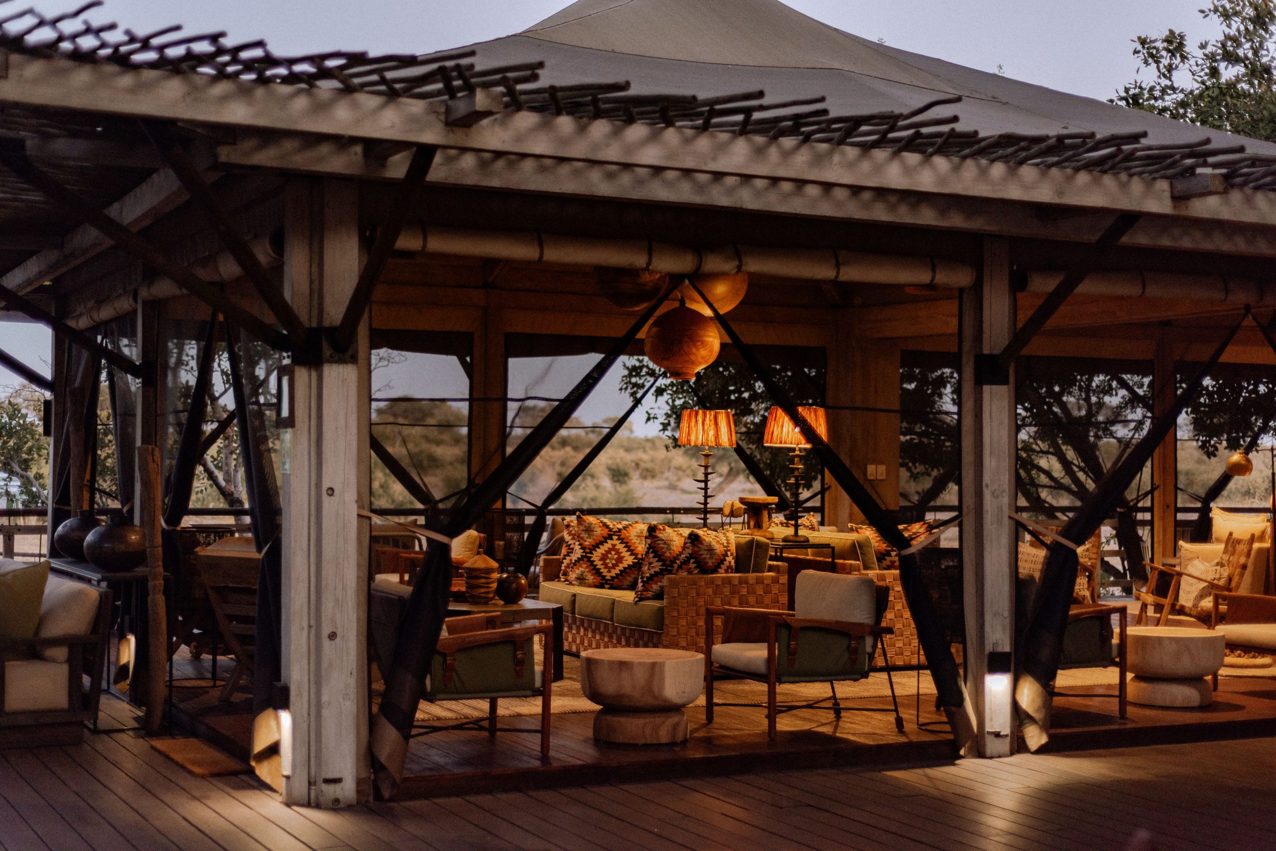 Head out to the unique viewing hide at dusk or dawn, overlooking the watering hole, and see elephants, hyenas and cheetahs in their element. Then find a serene welcome back at the lodge. The contemporary interiors reflects the earthy tones of the wilderness, while eco-friendly design features keep you in harmony with the stunning landscape. Using the best eco-friendly, sustainable practices, you’ll feel closer to the wildlife than ever before. Features include a luxury spa, a viewing hide overlooking the watering hole, and a stunning firepit with views of the Savute Channel. Raised on wooden platforms, each tented room affords breathtaking vistas across the shifting ecosystem. An outdoor lounge offers post-safari relaxation as giant bullfrogs croak within earshot. Or recline deck-side on your lounger; big game frequently mingle in full view at the adjacent watering hole. Inside, luxurious interiors feature a netted four-poster bed and lavish bathroom. A fully-stocked minibar and discreet air conditioning refresh and revive.