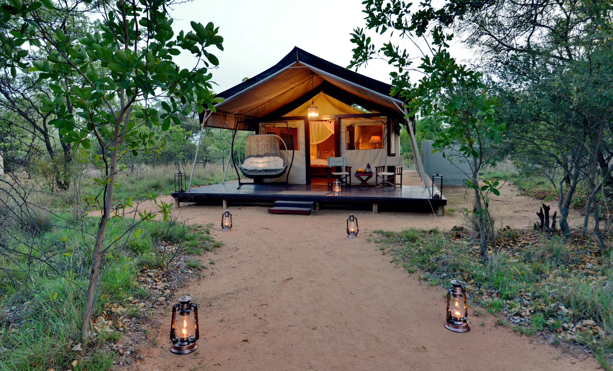 Safari Plains combines the elements of a great safari with the magic of great hospitality. Creating a luxurious setting with a sophisticated ambience. Like little jewels placed along winding sand pathways, each of the gorgeous tented suites commands a private space within the natural indigenous bush-veld. These safari-style tents offer great comfort and a luxurious ambience with private timber wrap-around decks. A romantic swing or authentic safari seating offers a great space to sit outdoors and enjoy the views over the waterhole. The six luxury tents offer a slightly larger main area and come complete with a private sala which is perfect for whiling away a lazy afternoon.