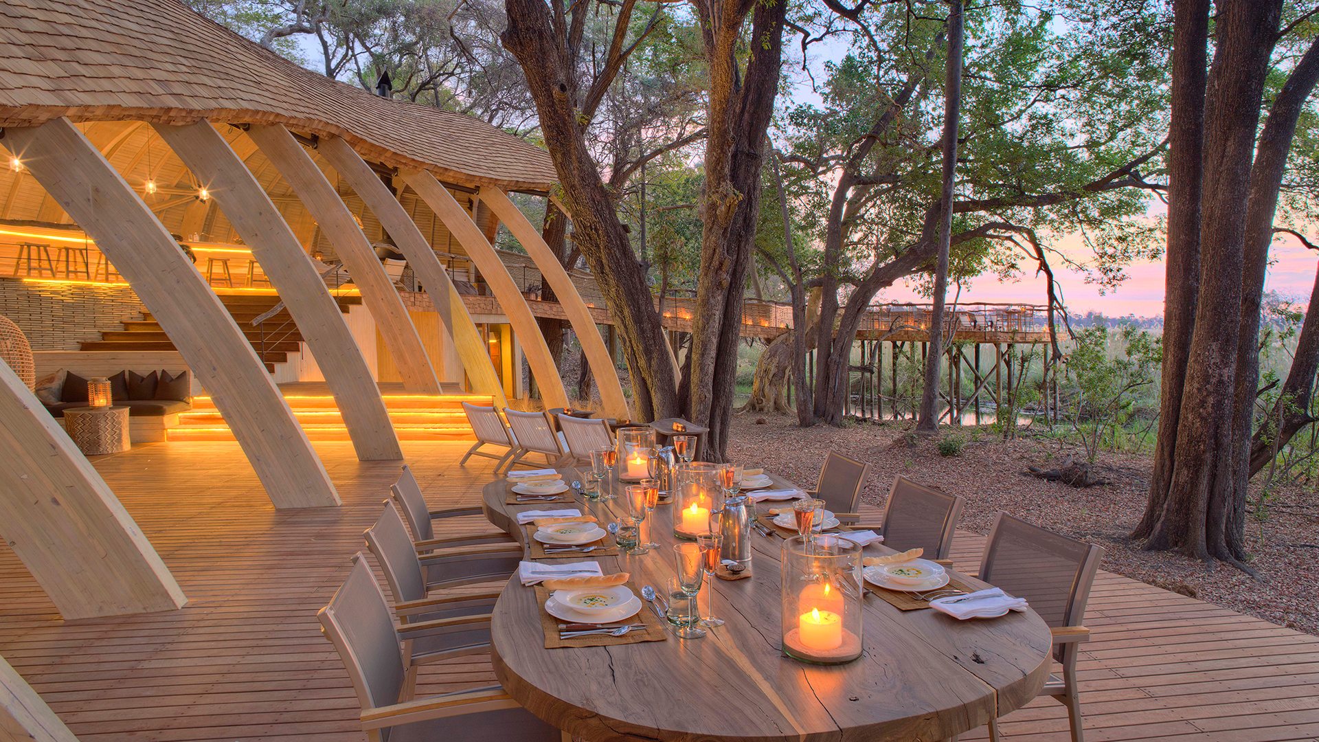 Inspired by nature and celebrating its stunning setting, the lodge features the best the Delta has to offer in terms of outstanding design, outstanding wildlife viewing and warm local hospitality. Set in a cool forest canopy of wild palms and gnarled fig trees, this flagship lodge blends seamlessly with one of Africa’s most breath-taking landscapes. Behind the lodge, golden-grassed floodplains inhabited by a staggering variety of wildlife stretch into the distance, framed by lush palm islands and the spires of giant termite mounds. A channel of clear, cool waters runs directly in front of the elevated guest suites, offering unrestricted views over the shimmering beauty of the Delta.